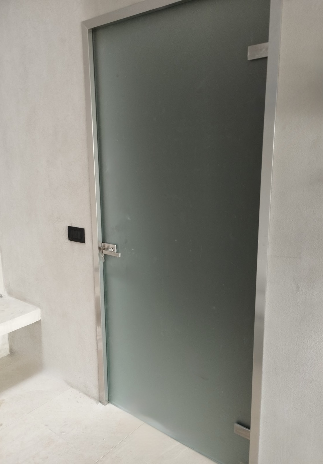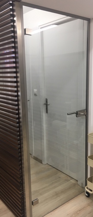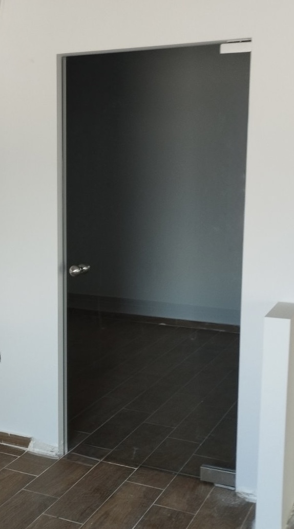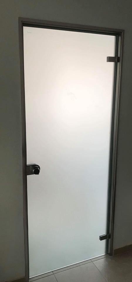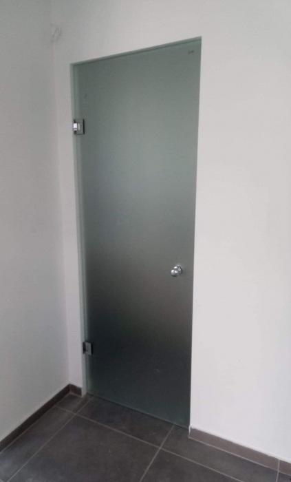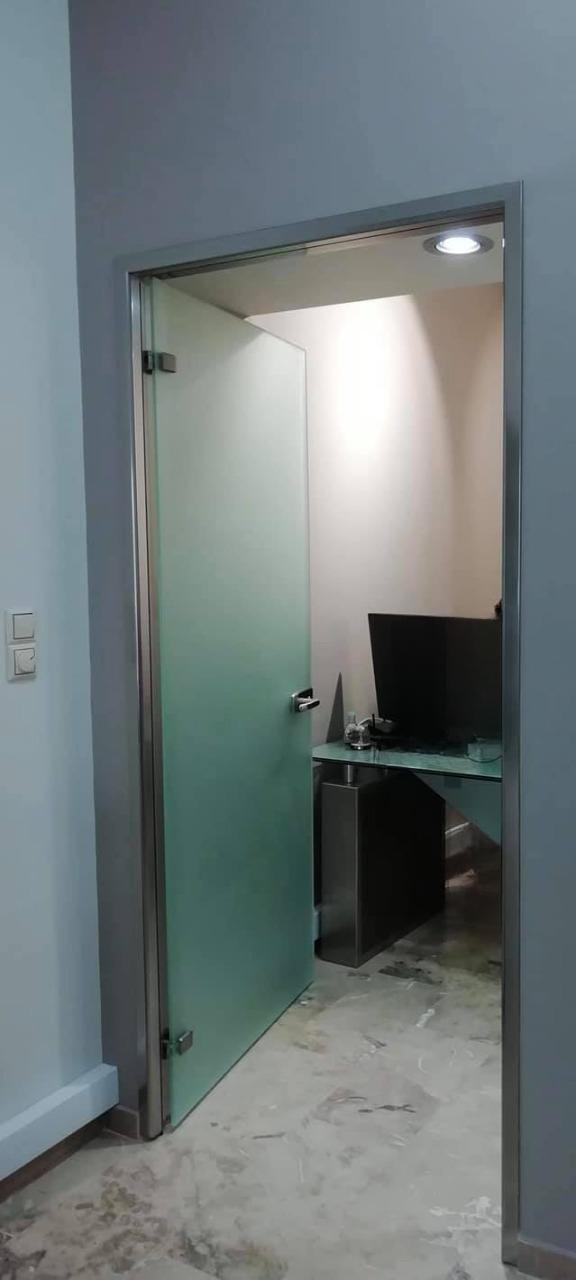 Το γυαλί που χρησιμοποιείται είναι 10mm securit σε διάφανο ή αμμοβολής (φθορίου), σε μεγάλη ποικιλία χρωμάτων, εκτός και αν θέλουμε έγχρωμη μεμβράνη που εσωκλείεται σε triplex υαλοπίνακα. Τα εξαρτήματα που χρησιμοποιούνται είναι inox ή αλουμινίου για τις συρόμενες. Με μηχανισμό δαπέδου ή μεντεσέδες inox για τις ανοιγόμενες. Όπως επίσης και με μοντέρνα κάσα, χαρίζοντας άψογη αισθητική.