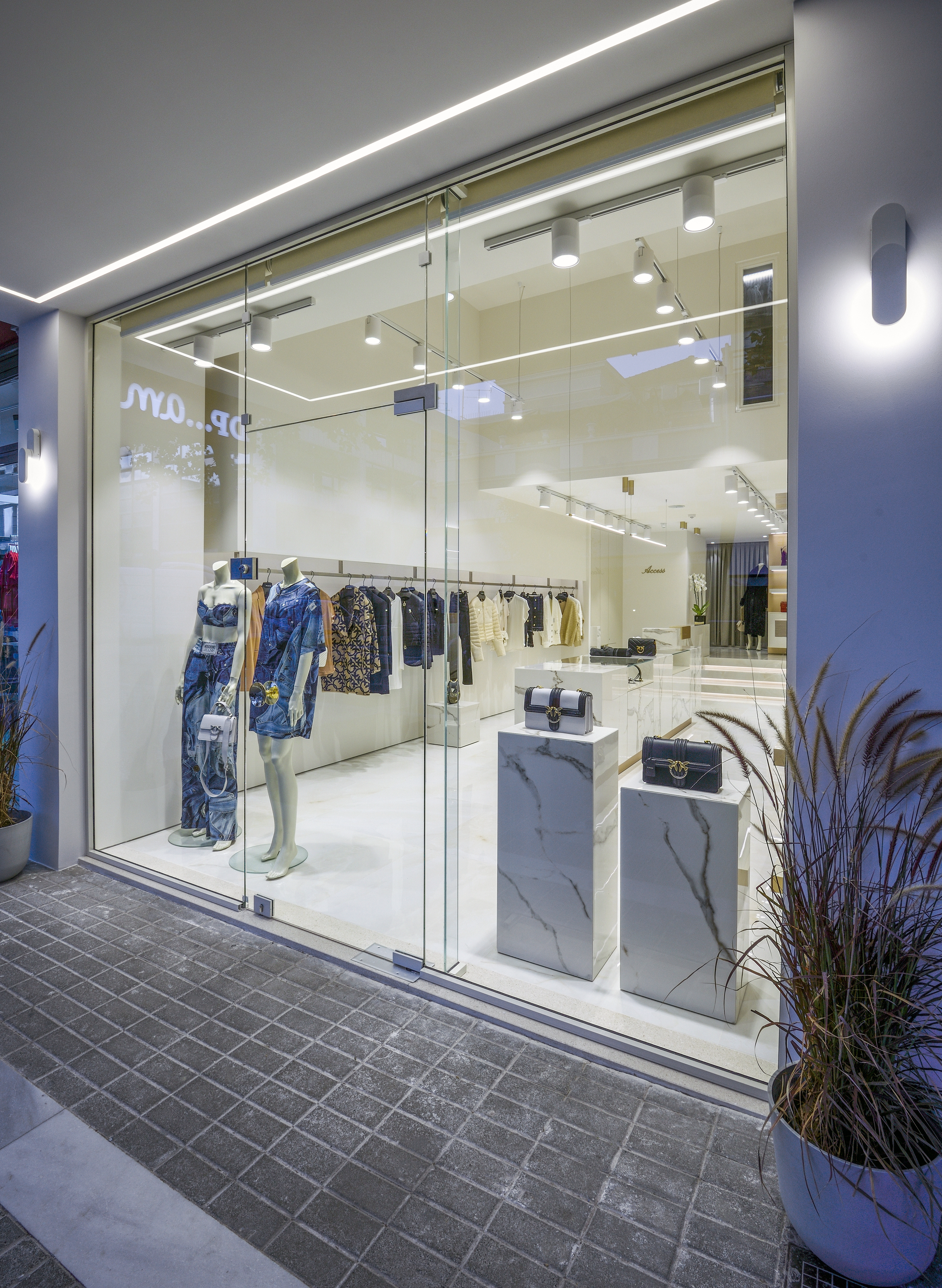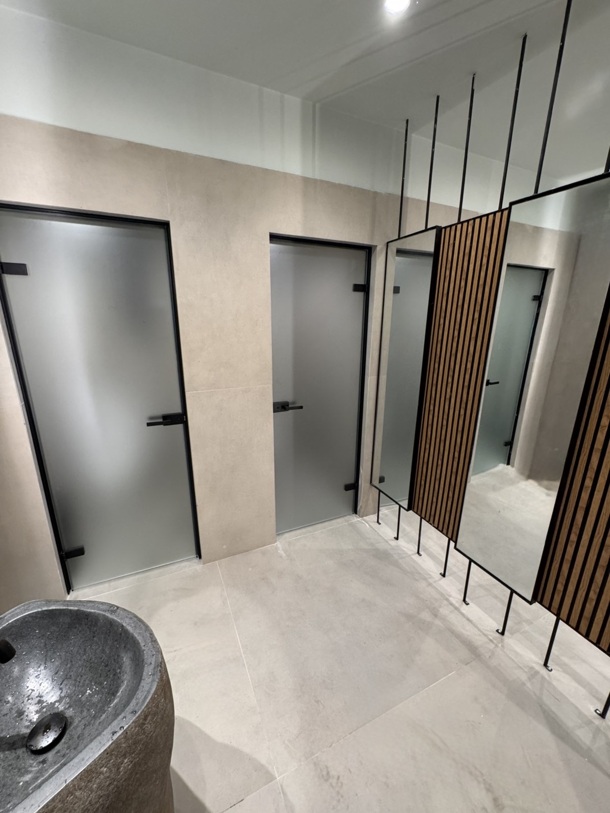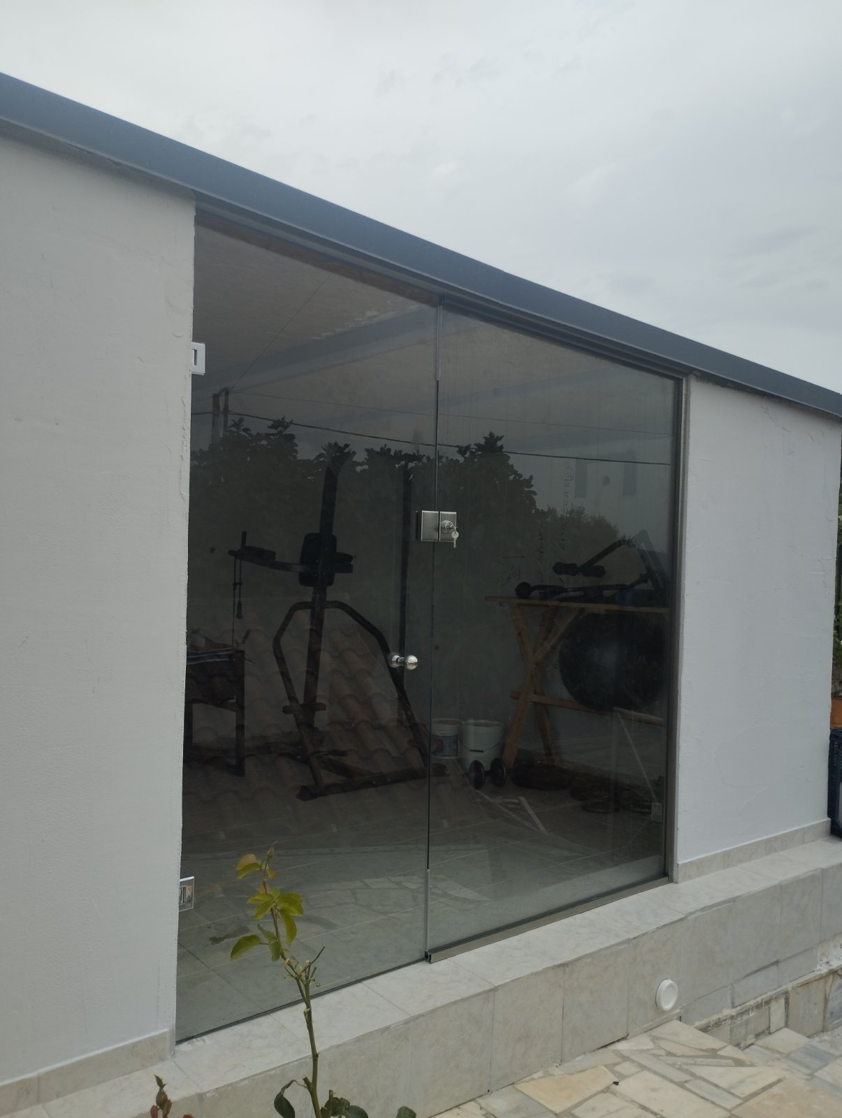 Το γυαλί που χρησιμοποιείται είναι 10mm securit σε διάφανο ή αμμοβολής (φθορίου), σε μεγάλη ποικιλία χρωμάτων, εκτός και αν θέλουμε έγχρωμη μεμβράνη που εσωκλείεται σε triplex υαλοπίνακα. Τα εξαρτήματα που χρησιμοποιούνται είναι inox ή αλουμινίου για τις συρόμενες. Με μηχανισμό δαπέδου ή μεντεσέδες inox για τις ανοιγόμενες. Όπως επίσης και με μοντέρνα κάσα, χαρίζοντας άψογη αισθητική.